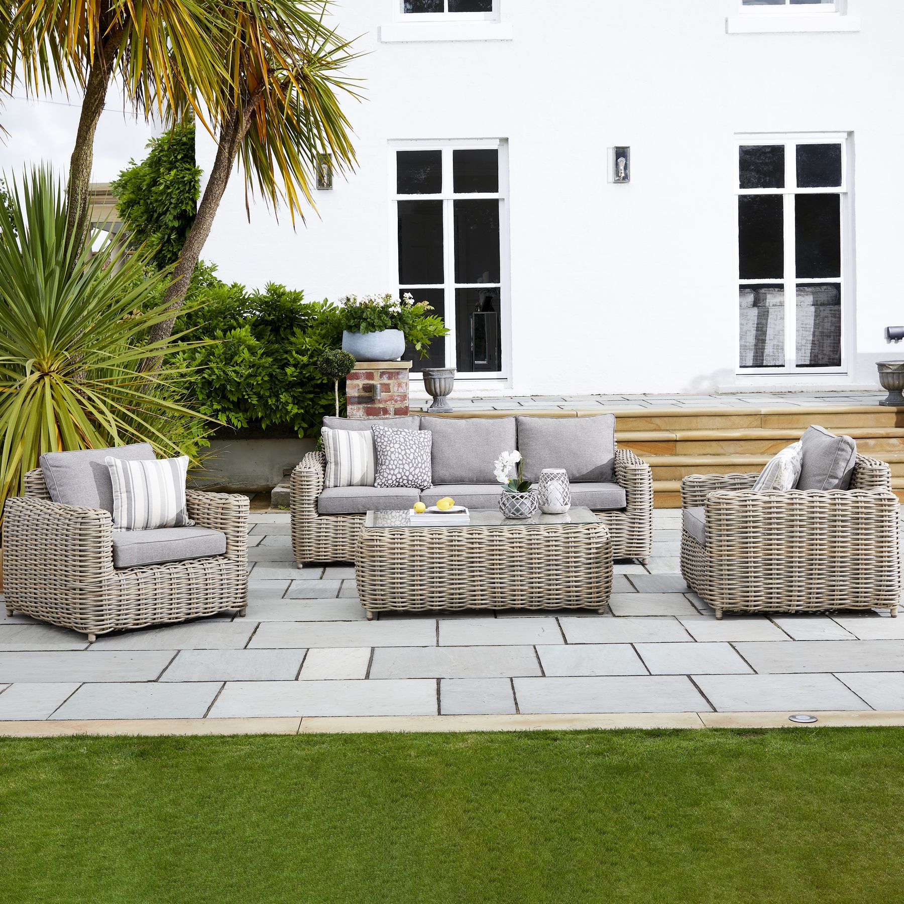 Embrace outdoor living with this meticulously designed five-seater set that combines authentic appearance with unmatched resilience. The round 12mm HDPE wicker weave creates an organic pattern that mimics natural materials while surpassing them in durability and weather resistance. The lightweight aluminum frame provides stability without compromising on portability, while the powder coating ensures long-term protection against environmental factors. The addition of grade 5 Olefin fabric cushions delivers superior comfort and practicality - their quick-drying properties and resistance to UV damage make them ideal for outdoor settings. The eco-conscious hardwood acacia coffee table crowned with tempered glass adds both functionality and refinement to the arrangement. For a coordinated outdoor aesthetic, consider pairing this set with the Pula or Leptis Magna table lamps for ambient evening lighting, or enhance the visual appeal with the Black Wood Round Framed Mirror or Washed Wood Window Mirror to create depth and reflection in your outdoor space. This collection maintains its fresh appearance with minimal maintenance - simple soap and water cleaning for the wicker and easy-care cushions that can be removed as needed. The set's year-round outdoor capability, combined with its shower-resistant and color-fast properties, ensures lasting value for retailers and customer satisfaction. Individual sizes Armchair: 90 x 92 x 72cm 3 Seater 210 x 92 x 72cm Table 120 x 63 x 42cm. Seat height is 59cm.