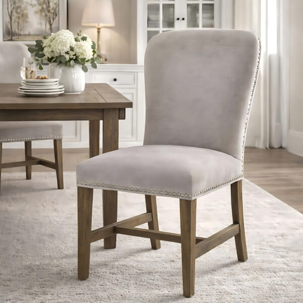 Bring refined sophistication to your collection with the Cobham Grey Dining Chair. This timeless piece marries classic French styling with contemporary comfort, featuring a gracefully curved backrest and luxurious grey upholstery adorned with antique brass studs. The weathered oak frame adds rustic warmth, while the generously padded seat promises lasting comfort. Perfect for both traditional and modern settings, this versatile chair works beautifully in dining rooms, studies, or as occasional seating. Style it with farmhouse tables for a country-chic look, or pair with glass and metal pieces for an elegant industrial fusion. The neutral grey palette complements both light and dark wood finishes, making it an excellent choice for various interior schemes. Trade buyers will appreciate the chair's broad appeal, quality construction, and ability to blend with multiple design aesthetics - from Hampton's coastal to French provincial. A reliable seller that promises to satisfy discerning customers seeking both style and substance.