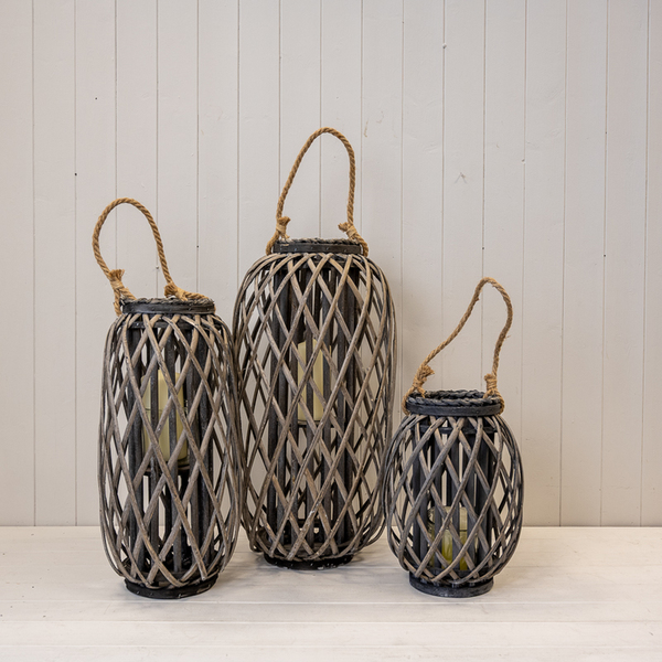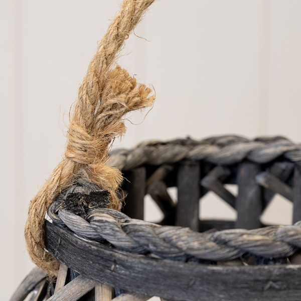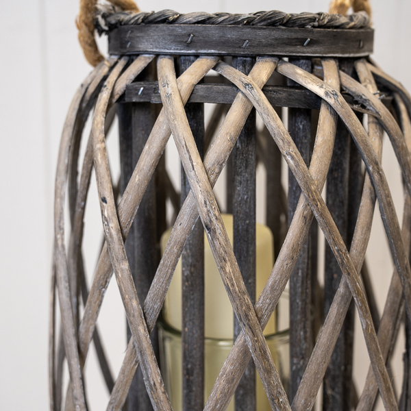 A tall grey wicker lantern with natural weaving and soft rustic texture—ideal for candles, porch décor, or cosy autumnal displays.