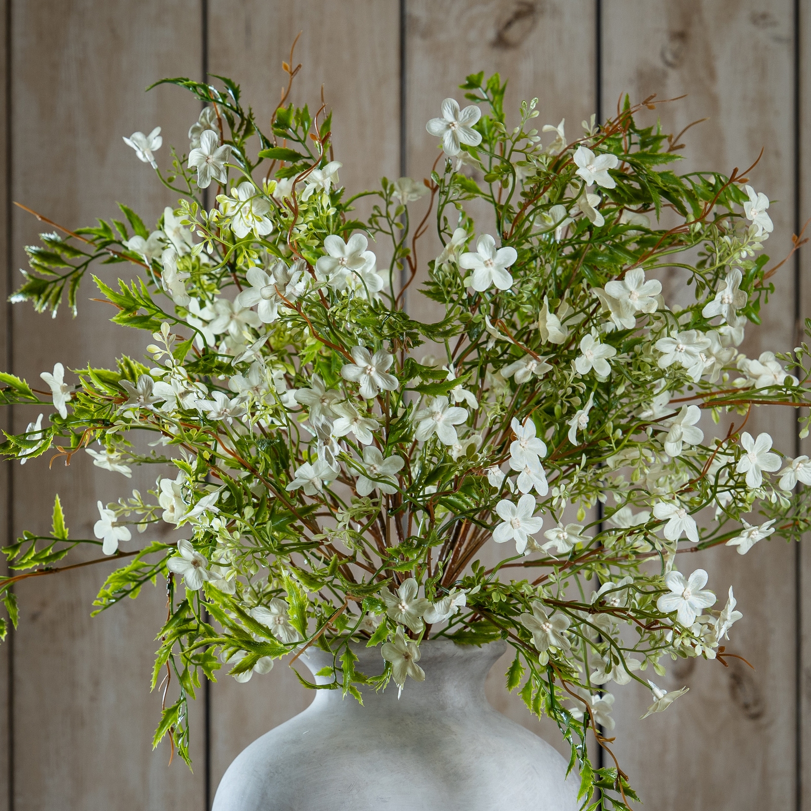 Bring natural serenity to your floral arrangements with this delicate white bellflower. Its pristine petals and graceful stems create an ethereal display that captures the essence of meadow botanicals. Perfect for modern and rustic interior settings, this artificial bloom pairs beautifully with our Cream Cosmos Spray, White Gypsophila, and Variegated Eucalyptus Bouquet for a complete botanical story. Display in our Darcy Antique White Vase to achieve a cohesive, refined look that appeals to design-conscious customers seeking authentic-looking permanent botanicals.