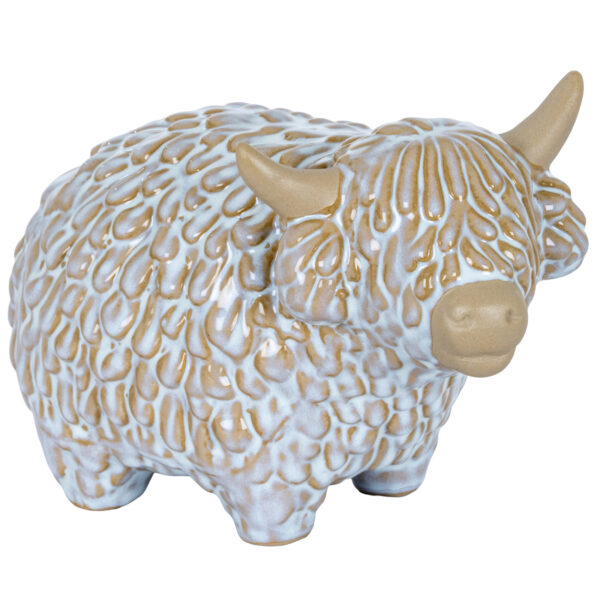 Celebrate rustic charm with this beautifully detailed ceramic Highland Cow sculpture. The piece showcases extraordinary attention to detail in the textured coat, with each fold and wisp carefully rendered to capture the characteristic shaggy appearance of these beloved Scottish animals. The sculpture's matte ceramic finish provides a contemporary interpretation of traditional countryside motifs, while maintaining authenticity in its representation. The neutral colour palette allows this piece to complement both modern and traditional décor schemes, making it an excellent choice for retailers catering to diverse customer preferences. The distinctive silhouette, with its characteristic horns and robust stance, creates an engaging focal point in any display setting. For optimal merchandising impact, consider pairing this Highland Cow with our range of coordinating ceramic vases in similar earthy tones, textured pottery pieces, or our collection of woven baskets. The addition of metallic accessories, particularly in brushed bronze or aged copper finishes, would create an appealing lifestyle display that resonates with customers seeking authentic, countryside-inspired decorative elements. This piece appeals to both traditional homeware enthusiasts and contemporary interior designers, offering versatility in styling and presentation. Its manageable size makes it ideal for shelf displays, counter arrangements, or as part of larger themed collections, providing retailers with flexible merchandising options.